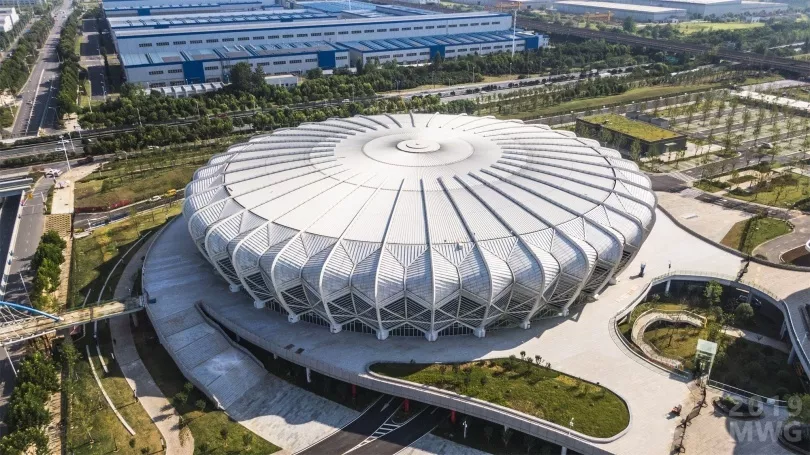 湖北省奥体中心综合馆是军运会体操(男子)项目比赛主场馆,整个外立面设计灵感来自于羽毛球造型,由36个单元环形阵列组成,整体观感极为惊艳。