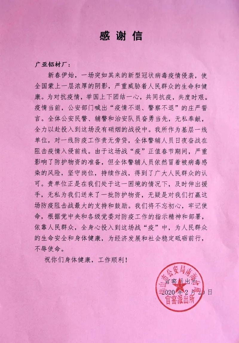 ballbet贝博铝业扎根官窑24年,一直与社区民警保持着良好警民关系。2月20日,集团人力资源部左小平总经理和ballbet贝博生产基地行政部范卫明经理前往官窑派出所向一线民警赠送了一批防护口罩,表达了全体ballbet贝博人在“战疫”的特殊时刻,一片爱警、拥警的赤诚之心。