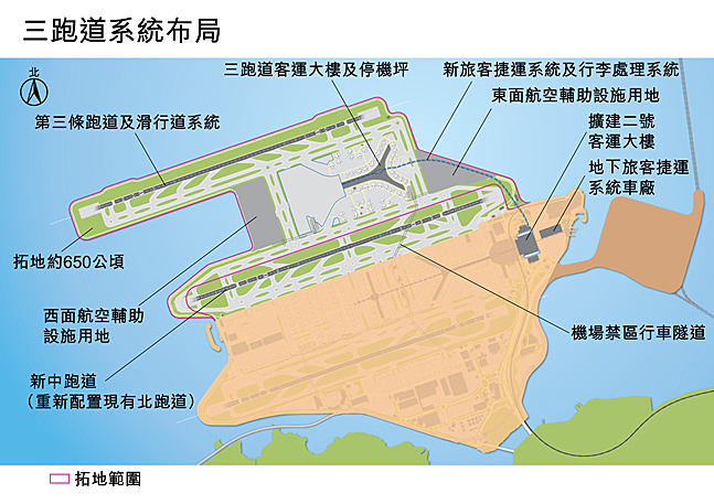 工程包括在现机场北填海拓地约650公顷;兴建面积超过28万平方米的客运大楼,57个停机位及停机坪等。据机场管理局预计,新跑道的建成,每年可新增处理客运量达3000万人次。 客运大楼是该项目的点睛之笔。机场管理局意在将其打造成全球最具效率和最环保机场双冠王。客运大楼除具备顶级机场通用设施外,在还大楼中庭设置庭院,广植草坪及树木,为旅客提供恬静舒适的环境。
