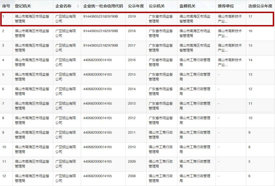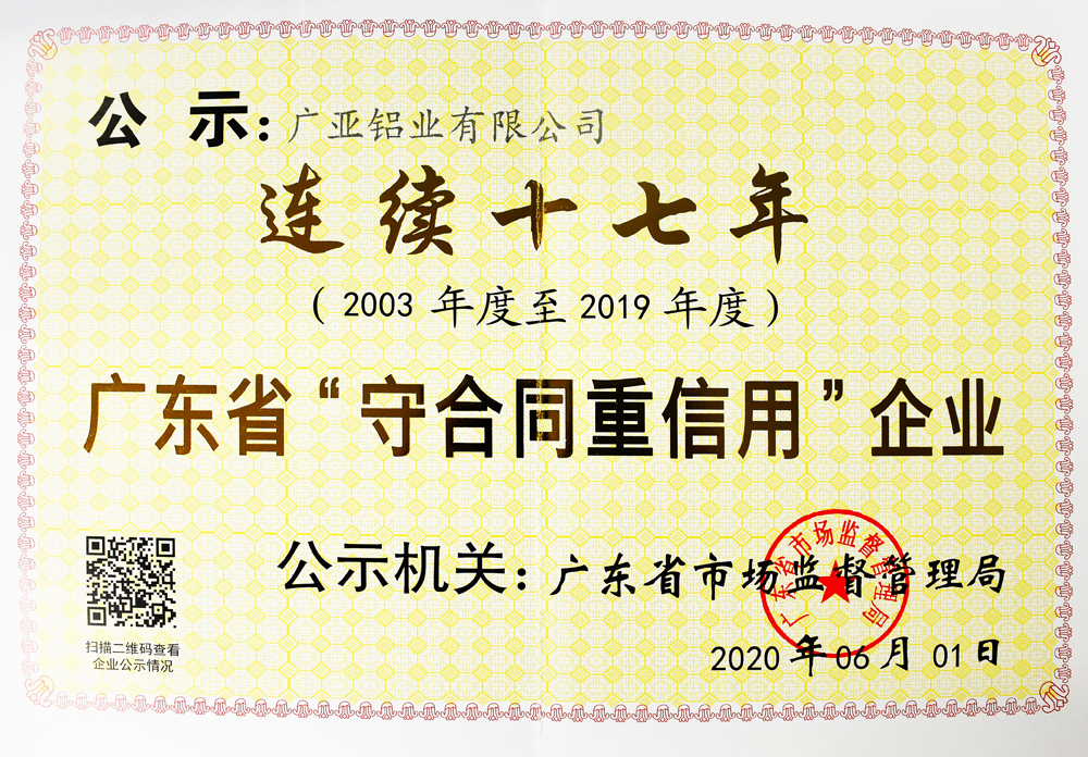 近日,为推动社会信用体系建设,鼓励企业加强合同和信用管理,广东省市场监督管理局组织开展的2019年度广东省“守合同重信用”企业公示名单出炉,ballbet贝博铝业2003年至2019年连续17年被公示为广东省“守合同重信用”企业。