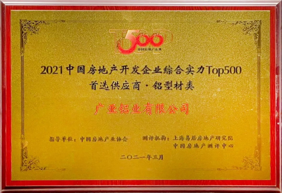 ballbet贝博铝业以良好的行业口碑及经营多年的综合实力,获评2021中国房地产开发企业综合实力TOP500铝型材类首选供应商品牌。