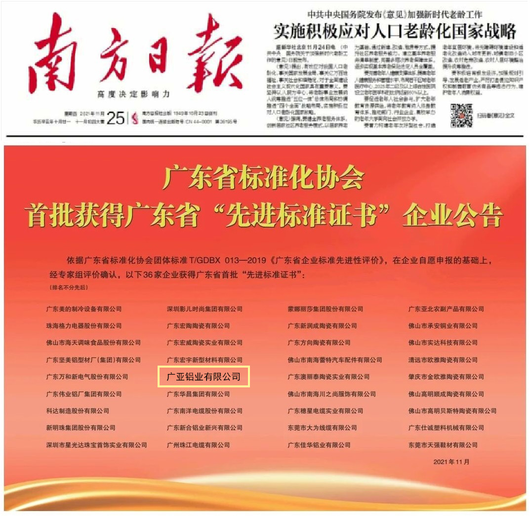 · 11月25日,《南方日报》刊登了首批获得广东省“先进标准证书”企业公告,ballbet贝博铝业荣誉上榜。