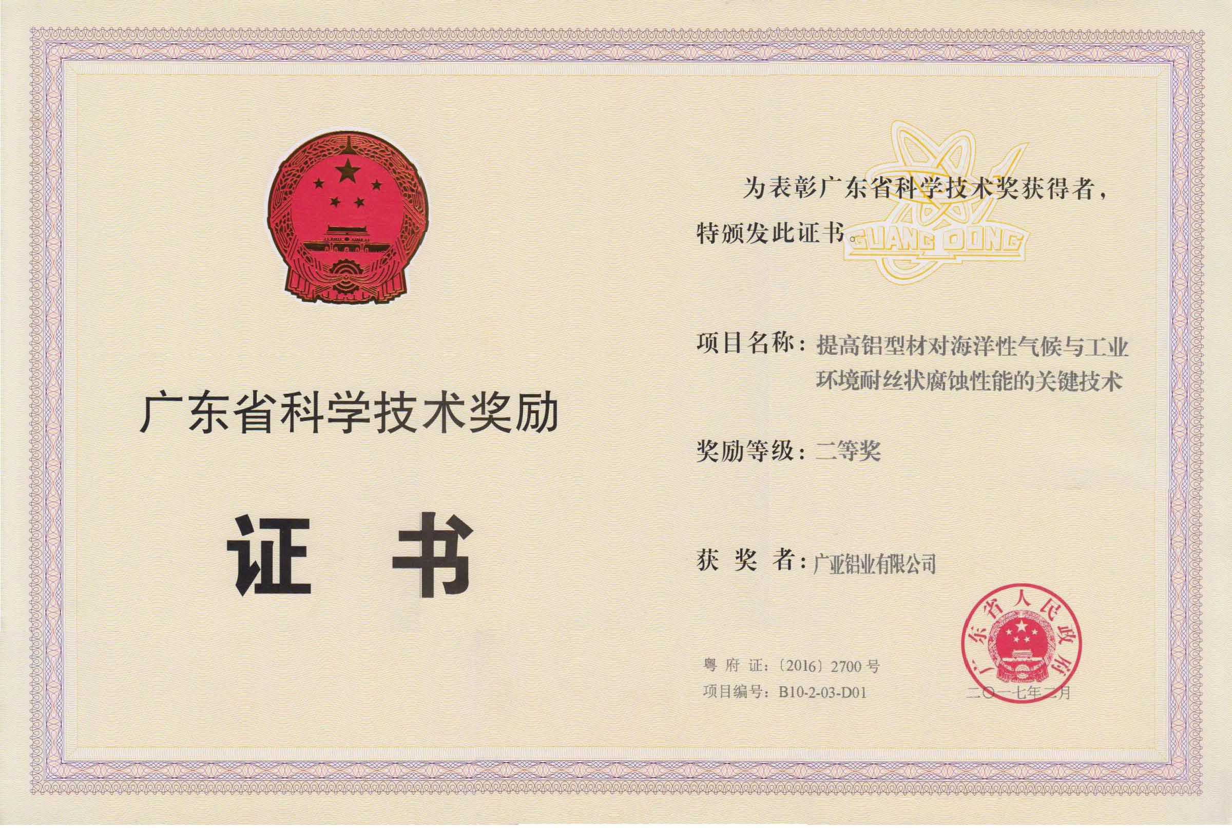 通过广泛的产学研合作,公司科研成果硕果累累,近年来先后获得中国有色金属工业科学技术进步奖一等奖1项、二等奖3项、三等奖1项,佛山市科学技术奖一等奖1项、三等奖2项,2017年《提高铝型材对海洋性气候与工业环境耐丝状腐蚀性能的关键技术》更是获得广东省科学技术奖二等奖。我司也重视知识产权保护,目前有效授权发明专利5项,实用新型专利59项,外观专利115项。企业还积极参与起草和制修订国际、国家和行业标准和联盟标准达40多项,多次获得技术标准优秀奖励。