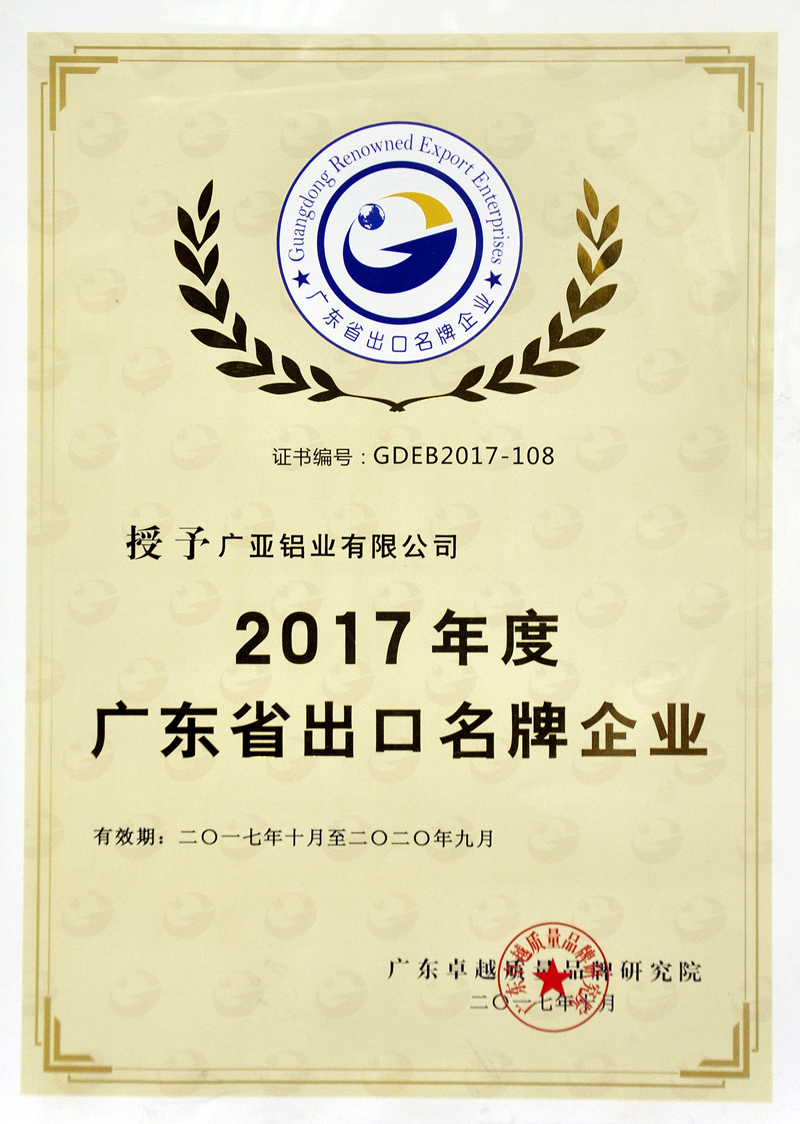 近日,2017年度“广东省出口名牌企业”名单正式公布,ballbet贝博铝业有限公司榜上有名,是广东省四家铝型材上榜企业之一。