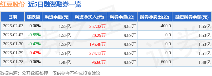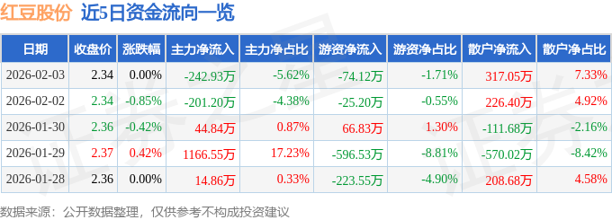 证券之星消息,截至2026年2月3日收盘,红豆股份(600400)报收于2.34元,上涨0.0%,换手率0.81%,成交量18.49万手,成交额4325.83万元。