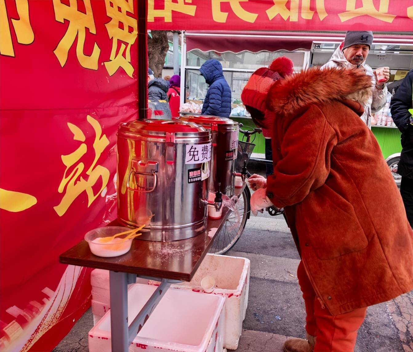 春节前夕,沈阳市铁西区赞工早市便民服务措施再次升级,由过去的室内“游客驿站”升级为室外的便民服务中心,扩大服务范围和服务对象,增加便民服务项目和服务功能,为游客和市民免费提供的粥、现磨豆浆和红糖姜水等热饮热食,同时也设立了应急药箱,塑料袋,充气筒,爱心暖宝,免费寄存等多项服务。