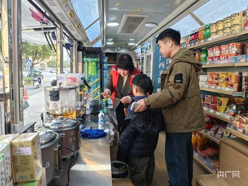 2月11日下午,记者见到毛文娟时,她正站在车厢窗口,为市民递上一杯热茶,那是本地一款花茶泡出来的,入口一股清香,“喜欢喝的可以上车购买。”毛文娟笑着说。