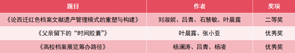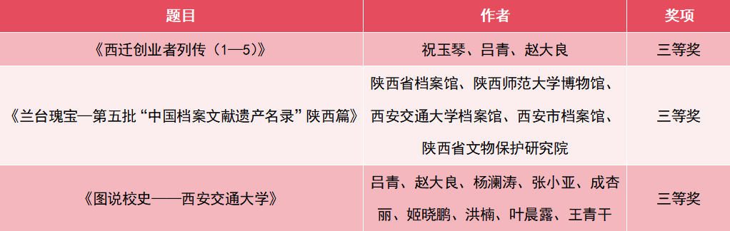 近日,陕西省档案学会2019-2024年度全省档案学优秀成果评选结果揭晓。经过专家严格评审,本次评选共产生64项获奖成果,其中论文类一等奖3项、二等奖7项、三等奖9项、优秀奖34项;著作类一等奖1项、二等奖3项、三等奖7项。西安交通大学档案馆凭借深厚的档案文化积淀以及创新的实践探索,在此次评选中获论文类二等奖1项、优秀奖2项,著作类三等奖3项,获奖总数位居全省高校档案馆首位。